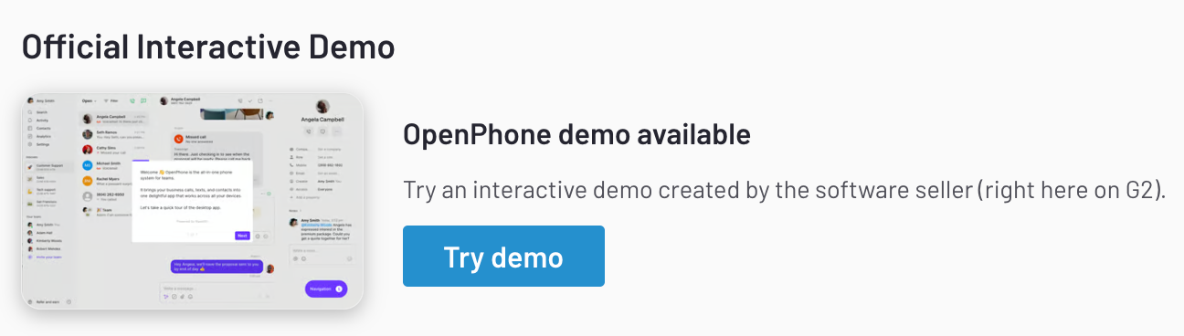 OpenPhone, a voice-over-internet-protocol (VoIP) product, added a Navattic demo to its G2 profile to show off the main value props of its desktop app.