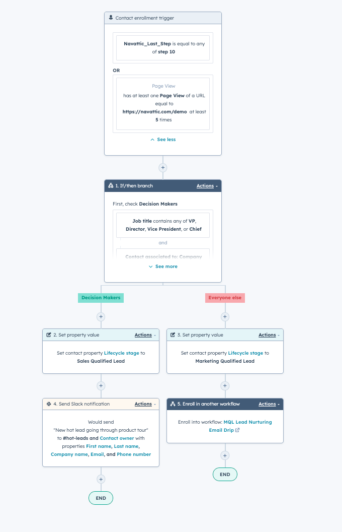 For example, Navattic customers might set up a Contact enrollment trigger to begin the lead routing process when a user has hit the last step in their interactive demo or viewed the demo page at least five times.