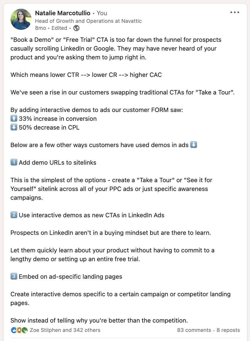 I listed a few other ways to incorporate interactive demos into an outbound marketing strategy to make the post as valuable and actionable as possible. Because the post got a lot of engagement, I turned it into an ad.