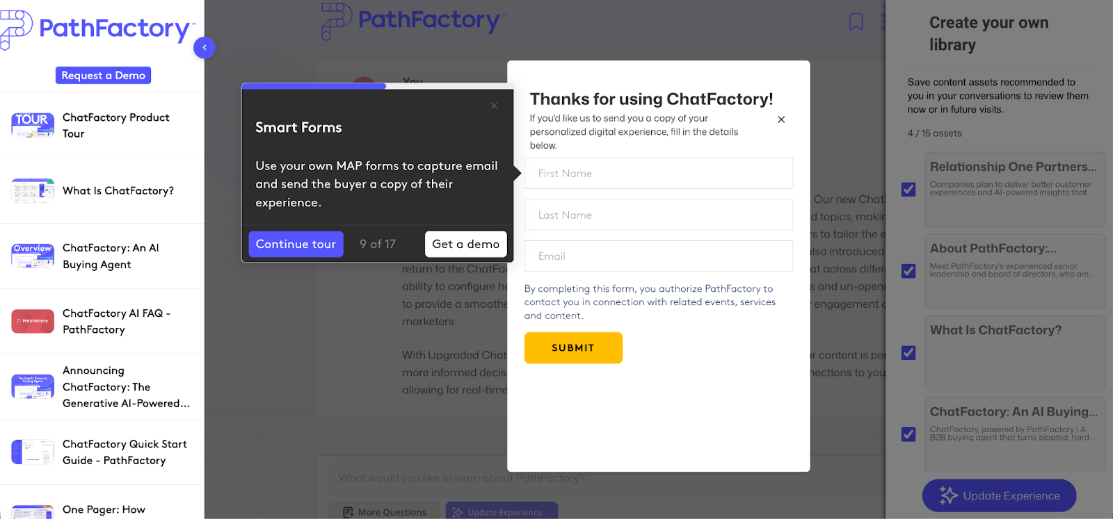Halfway through the tour, users can sign up for a live demo or continue learning about how to configure and customize ChatFactory to surface relevant content and maintain brand voice.