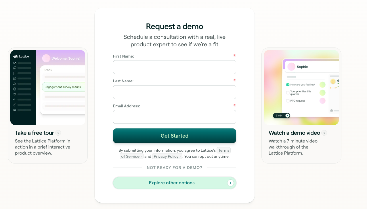 On their Request a demo form, Lattice gives people who aren’t ready for a demo additional options, like taking a tour or watching a demo video.
