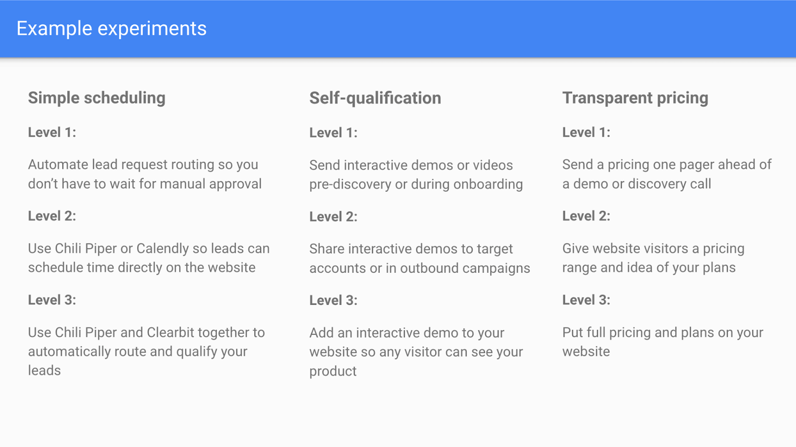 If you’re looking for some guidance on different experiments, here are a few different buyer experiences you can test at varying degrees: