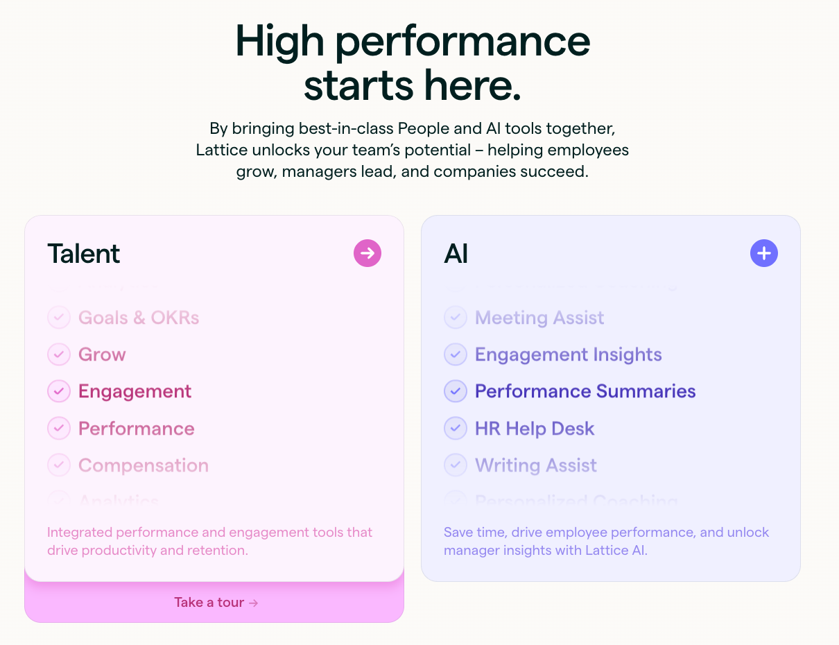 As users scroll down the homepage, they are invited to take a tour when they hover over Lattice’s Talent or AI-related features.
